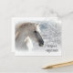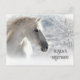 Un cheval époustouflant avec une crinière flottante, entouré d'une douce chute de neige et d'une scène glaciale pittoresque, avec texte personnalisé pour cette carte postale de Noël festive.