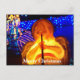 Joyeuses Fêtes Joyeux Ange de Noël Carte postale avec Ange de Noël éclairé contre un arrière - plan bleu ornant la nuit parmi les lumières de Noël annuelles dans le centre-ville de Mount Dora, Floride.