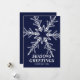 Carte de Noël moderne et audacieuse avec un grand flocon de neige, des "Joyeuses Fêtes" en texte blanc, et un arrière - plan bleu marine. Personnalisez-le avec votre propre texte à l'avant et à l'arrière.