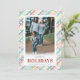 Cette carte de Noël moderne est ornée d'un arrière - plan rayé audacieux. Les rayures d'aquarelle aux couleurs turquoise, rouge et or apparaissent dans un motif en diagonale croisée. Le message de bienvenue "Joyeuses Fêtes" apparaît en rouge turquoise et foncé sous la photo.