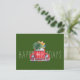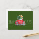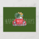 Texte personnalisable Joyeuses Fêtes avec une voiture rouge de style aquarelle avec un scarabée, surmontée d'un arbre de Noël et de cadeaux sur fond vert foncé