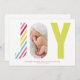 Ce design comprend le mot JOY. Le J est composé d'un motif rayé en diagonale coloré, et le Y est vert clair. Le O affichera votre photo.