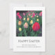 Bonne carte de voeux religieuse de Pâques, avec un tulipe coloré design sur un arrière - plan blanc. Avec une élégante typographie noire, vous pouvez ajouter votre propre message. Une belle façon de souhaiter à ses proches une Pâques heureuse.