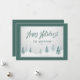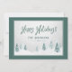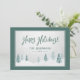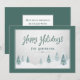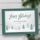 Elégante carte de vacances à la campagne avec "Happy Holidays" en calligraphie de style manuscrit avec votre nom de famille personnalisé et l'année dans une typographie de style rustique couleur pin d'épinette bleue. Une vue artistique pittoresque sur les arbres et la neige d'hiver met en valeur l'avant de la carte accentuée dans un cadre agréable et vert de pin. Le dos de la carte, également en vert pin, dispose d'un espace texte pour votre message de vacances personnel ou peut être laissé vide pour que vous l'écrivez à la main si nécessaire. Disponible en stock de carte imprimé de haute qualité pour l'envoi standard ou un format numérique téléchargeable pour l'envoi rapide et facile par SMS, email ou même auto-impression.