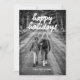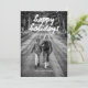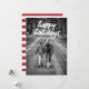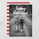 Joyeux carte photo de vacances avec les mots "joyeuses fêtes", en blanc, gras police de police de police, et noir et blanc modèle photo avec deux filles marchant sur le chemin. L'arrière de ces cartes de Noël à plat 5x7 2014 comporte un motif à rayures horizontales rouge et blanc festif.