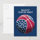 Carte postale Joyeuse 4 juillet Holiday avec l'illustration d'un basket-ball aux couleurs bleu, rouge et blanc.