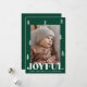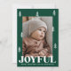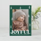 Célébrez la saison avec cette carte de Noël photo festive avec votre photo verticale encadrée de pins blancs dessinés à la main sur un riche arrière - plan vert. Le mot "Joyful" s'affiche en caractères blancs gras, avec votre salutation de vacances personnalisée et le nom de famille indiqué ci-dessous. Le dos affiche une série de photos supplémentaires contre un arrière - plan vert coordonnant avec des points blancs subtils, ce qui fait de cette carte de vacances personnalisée une belle façon de partager des voeux de Noël chaleureux.