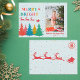Carte de voeux de Noël joyeux et colorée. Des lettres peintes à la main et des détails de vacances avec le Père Noël volant avec ses amis de rennes. Carte de voeux de Noël de conservation très spéciale pour vos proches. Avec l'art original et facile à personnaliser votre nom, année et photo.