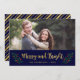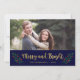 Carte photo de vacances avec les mots "Merry and Bright" dans un script élégant en faux or entouré de feuilles festifs et baies contre un arrière - plan bleu. La carte comprend une bande bleue et faux or à l'arrière. Consultez d'autres articles de vacances ici https://www.zazzle.com/collections/holiday_christmas_new_year_cards-119015800351034065?rf=238364477188679314 Personnalisez-le en remplaçant le texte de l'espace réservé et remplacez l'exemple/l'espace réservé photo par votre propre photo. Pour plus d'options comme changer la police et sa taille, cliquez sur le bouton "Personnaliser". *Veuillez noter que le filigrane Zazzle qui apparaît dans l'aperçu du zoom n'apparaîtra PAS sur le produit imprimé final. © Bois de rose et agrumes