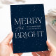 Carte de vacances moderne avec "Joyeux et lumineux" en lettres blanches et arrière - plan marine avec points blancs subtils (neige). Personnalisez l'avant de la carte de vacances sans photo avec votre nom de famille et l'année en lettres blanches. La carte s'inverse pour afficher votre message personnel en lettres de marine ou laisser vide pour écrire le vôtre.