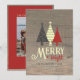 Élégante, unique, simple, carte de vœux de Noël rétro moderne Merry and Bright noir jaune et rouge, avec des arbres de pin colorés, du bois rustique et une photo au dos.