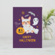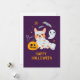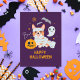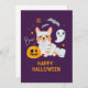 Cette adorable carte de vacances d'Halloween présente une illustration ludique d'un Corgi enveloppé de bandages de momie, entouré d'éléments d'Halloween comme une citrouille-lanterne effrayante, un fantôme amical, des chauves-souris et une toile d'araignée. Sur un fond violet foncé, le texte "Joyeux Halloween" en orange vif ressort, ce qui en fait un choix amusant et festif pour les amoureux des chiens et les passionnés d'Halloween. Parfait pour répandre la joie d'Halloween avec une touche de mignonnerie !