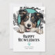 Happy Howlidays Collie Sheepdog Pet Chien de Noël Carte de vacances de Ricaso - conçue avec une merveilleuse typographie Happy Howlidays texte à l'avant - une carte de vacances à thème chien amusant, votre membre de famille furry mérite d'envoyer ses propres voeux de vacances .. facile d'ajouter votre propre texte et photo - avec un motif empreinte de patte amusant et audacieux à l'arrière conçu en noir et blanc
