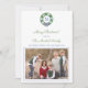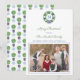 ** Crédit photo : Photographie © Storytree Studios, Stanford, CA ** Preppy Happy Holidays Design carte photo avec une couronne de boxwood vert décorée de décorations bleues et blanches. Au centre de la couronne se trouve l'espace pour un monogramme à une seule lettre. L'envers est composé d'un motif de topiaire en bois de boxe dans une jarre de gingembre. Si vous préférez, vous pouvez facilement ajouter votre photo au verso (suivez les instructions dans la zone "personnaliser ce modèle".