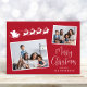 Carte Festive rouge de vacances avec 2 photos éparpillées dans des cadres blancs, une silhouette blanche de rennes volant le traîneau à Père Noël, "Joyeux Noël" dans un script blanc élégant et votre nom dans une simple typographie blanche moderne.