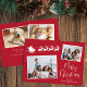Carte Festive rouge de vacances avec 2 photos éparpillées dans des cadres blancs, une silhouette blanche de rennes volant Père Noël traîneau, "Joyeux Noël" dans un script blanc élégant et votre nom dans une simple typographie blanche moderne. Ajoutez 2 photos supplémentaires et un message customisé sur le dos.