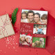 Simple carte de vacances de collage de photo rouge. "Joyeux Noël" est écrit dans un script blanc élégant et vous pouvez personnaliser avec 4 photos et votre nom de famille et l'année dans la typographie blanche moderne.