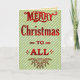 Ce design festif de cartes de voeux comprend les mots "Joyeux Noël à tous" en lettres rouges vifs avec diverses polices et des fleurs. En bas, il a un plus grand mistletoe fleurit avec des feuilles verts et de petits fruits rouges. Tout cela repose sur un arrière - plan rayé vert clair fait pour paraître décoloré et moucheté de façon vintage / antique. L'intérieur a une coloration vintage et usée avec plus de taches blanches qui ressemblent à de la neige tombante. Il vous permet également d'ajouter votre message personnel ou simplement de supprimer l'exemple de texte pour le laisser vide. Vous pouvez également cliquer sur "Customiser" pour plus de fonctionnalités, comme l'ajout de votre propre photo à l'intérieur à gauche. Il s'agit d'une carte simple et élégante pour les vacances d'hiver de Noël. Consultez les articles correspondants dans notre magasin.
