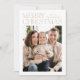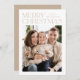 Carte photo moderne de Noël avec "Joyeux Noël" affichée en haut du design en lettres beiges claires et tendance avec un arrière - plan blanc. Personnalisez la simple carte de Noël avec votre nom de famille et votre photo. La carte inverse pour afficher un arrière - plan beige clair avec des points blancs subtils (neige).