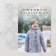 Carte photo de vacances de style traditionnel dispose d'une image verticale avec texte personnalisé "Joyeux Noël" avec défilement que vous pouvez personnaliser avec votre nom de famille et l'année. Un motif de flocons blancs habille le dos de la carte. Les couleurs classiques rouge, vert et gris peuvent être customisées. Photographie © Storytree Studios, Stanford, CA