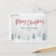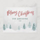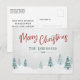 Cartes postales rustiques avec "Joyeux Noël" dans un style manuscrit avec votre nom ou nom de famille personnalisé et l'année, le tout en rouge & pin vert typographie vintage. Une belle vue pittoresque sur les arbres et la neige hivernale dans l'aquarelle d'art souligne l'avant de la carte. Le verso de la carte contient de l'espace texte pour votre message de vacances personnel ou peut être laissé vide pour que vous en écrivez un à la main si nécessaire.