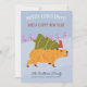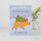 Cette carte de vacances fantaisiste comporte une capybara illustrée portant un chapeau de Père Noël rouge, portant un arbre de Noël sur le dos. L'arrière - plan est une scène hivernale enneigée avec des pins roses, triangulaires et un ciel bleu doux, créant une atmosphère festive et joyeuse. Le texte ludique dit : "Joyeux Noël ! Et une bonne année," en utilisant un jeu de mots pour ajouter humour et charme. L’expression détendue et déterminée du capybara vient compléter l’esprit de fête légendaire de la carte. Parfait pour répandre joie et sourires pendant la saison festive.