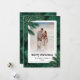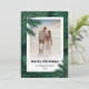 Joyeux Noël famille photo carte de voeux. Cette carte peut être personnalisée avec votre photo de famille et le nom à envoyer à la famille, amis et collègues. Orné d'un motif vibrant d'aiguilles et de branches de pin vert.