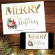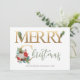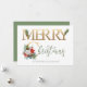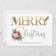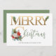 Carte de vacances personnalisée avec poinsettia, cônes de pin, roses blanches, baies d'hiver, coton, eucalyptus et sprigs de sapin. Le libellé se lit simplement "joyeux noël" en fausse feuille d'or et en lettres de main verte. Le modèle est configuré pour que vous puissiez ajouter votre signature et votre nom. Un design festif simple et élégant avec des fleurs d'hiver traditionnelles et du feuillage.