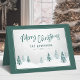 Elégante carte de vacances à la campagne pliée avec "Joyeux Noël" en calligraphie de style manuscrit avec votre nom de famille personnalisé et l'année dans une typographie de style rustique couleur pin d'épinette bleue. Une vue artistique pittoresque sur les arbres et la neige d'hiver met en valeur l'avant de la carte accentuée dans un cadre agréable et vert de pin. À l'intérieur de la carte, également en vert pin, dispose d'un espace texte pour votre message de vacances personnel ou peut être laissé vide pour vous de l'écrire à la main si nécessaire. Disponible en stock de carte imprimé de haute qualité pour l'envoi standard ou un format numérique téléchargeable pour l'envoi rapide et facile par SMS, email ou même auto-impression.