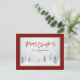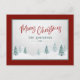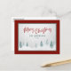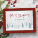 Elégante campagne de vacances Cartes postales avec "Joyeux Noël" en couleur rouge, calligraphie de style manuscrit avec votre nom de famille personnalisé et l'année dans une typographie de style rustique couleur pin d'épinette bleue. Une vue artistique pittoresque sur les arbres et la neige hivernale met en évidence l'avant de la carte accentuée dans un cadre agréable, rouge & pin vert.