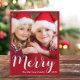 Elégante carte de vacances pliée rouge saisonnière avec votre photo, "Joyeux" dans un script blanc élégant et votre nom et année. A l'intérieur, ajoutez un accueil personnalisé et saisonnier.