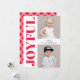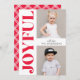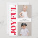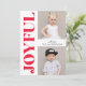 Carte photo de vacances élégant et moderne avec "Joyful" dans une police rouge audacieuse et tendance le long du côté gauche de la carte. Personnalisez l'avant de la carte en ajoutant deux de vos photos préférées et votre nom. La carte de vacances mignonne revient pour présenter deux photos supplémentaires, l'année, et un motif blanc chic avec un arrière - plan rouge. Conçu pour coordonner avec notre collection Joyful Modern de vacances.