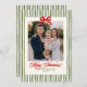 Des cartes photos de Noël Joyeux personnalisés avec une bordure rayée verte et un arc rouge festif offrent une façon intemporelle et élégante de partager votre message de vacances avec style. Cette carte de Noël personnalisée en une photo est idéale pour les familles, les couples ou les entreprises qui souhaitent envoyer des salutations chaleureuses avec un design traditionnel moderne et raffiné. Le message en gras "Joyeux Noël" est jumelé à une mise en page verticale propre qui fait de votre photo personnalisée le point focal. Que vous partagiez des jalons familiaux, le premier Noël du bébé ou une note professionnelle de fin d’année, ce modèle de carte photo de Noël est conçu pour laisser une impression durable. Conçue pour une personnalisation facile, cette carte est idéale pour les acheteurs à la recherche d'élégantes cartes de Noël rouge et vert, de cartes photos de vacances en famille élégants ou de modèles minimalistes de cartes de fête. Avec sa combinaison de couleurs de vacances classiques et de disposition moderne, cette carte de Noël Joyeux unique est un choix exceptionnel pour répandre la joie pendant la saison dans un format personnalisé et visuellement saisissant. Disponible sous forme de cartes imprimées ou en téléchargement numérique instantané.