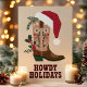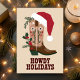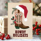 Célébrez la saison avec une touche de charme western avec cette carte de Noël "Howdy Holidays". Avec une botte de cowboy festive ornée de verdure de Noël et d'un chapeau de Père Noël, cette carte est parfaite pour ceux qui aiment une touche de campagne à Noël. Idéale pour les cowboys, les cowgirls et les amateurs de décoration de Noël rustique, cette carte apporte une chaleur et un esprit western à vos vœux de Noël.