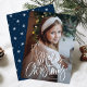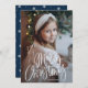 Carte photo de vacances mignon avec "Joyeux Noël" présenté au bas de la carte dans un script manuscrit blanc. Personnalisez la carte de Noël avec votre photo verticale et votre nom de famille. La carte revient à un motif de la marine et du flocon blanc.