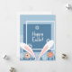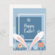 Arrière - plan bleu, cadre blanc avec de mignons oreilles lapins de pâques, fleurs et feuillage au fond, dit Joyeux Pâques