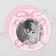 Carte de vacances ronde unique. Carte de Noël photo avec un nœud rose mignon parfaite pour le premier Noël de bébé. Le design présente un nœud rose coquette tendance encadrant votre photo personnalisée. Personnalisez tout le texte avec votre vœu de vacances. Espace au dos pour un message plus long également.