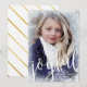 Carte de Noël inspirée du pays des merveilles hivernales, avec un cadre dépoli de neige en poudre et des flocons de neige autour de votre photo de choix. De l'autre côté de la moitié inférieure, le joyeux est écrit dans un grand script. L'arrière présente des bandes diagonales en feuille d'or imitation.