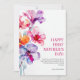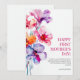 Joyeux premier anniversaire de fête des mères ! La carte de vœux Floral Elegant présente un magnifique arrangement floral à l'aquarelle dans des tons de rose, de violet et d'orange, ajoutant une touche vibrante et élégante. Le recto comprend le message "JOYEUX PREMIER ANNIVERSAIRE DE FÊTE DES MÈRES !" dans une police sophistiquée, associé à un mot doux et encourageant sur le parcours de la maternité.