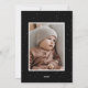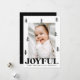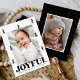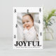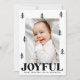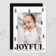 Carte Festive de Noël avec votre photo verticale entourée de pins noirs dessinés à la main avec un arrière - plan blanc. "Joyful" s'affiche en gras noir avec votre salutation personnalisée et le nom de famille indiqué ci-dessous. La joyeuse carte de Noël revient pour afficher une photo supplémentaire et un arrière - plan noir avec des points blancs subtils.