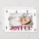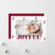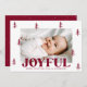 Carte Festive de Noël avec votre photo horizontale entourée de pins bordeaux dessinés à la main avec un arrière - plan blanc. "Joyful" est affiché en caractères gras bordeaux avec votre salutation personnalisée et le nom de famille indiqué ci-dessous. La joyeuse carte de Noël revient pour afficher une photo supplémentaire et un arrière - plan bordeaux avec des points blancs subtils.