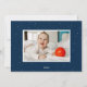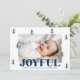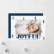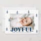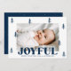 Carte Festive de Noël avec votre photo horizontale entourée de pins de marine dessinés à la main avec un arrière - plan blanc. "Joyful" s'affiche en gras marine avec votre salutation personnalisée et le nom de famille indiqué ci-dessous. La joyeuse carte de Noël revient pour afficher une photo supplémentaire et un arrière - plan de la marine avec des points blancs subtils.