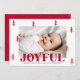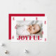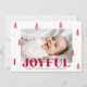 Carte Festive de Noël avec votre photo horizontale entourée de pins rouges dessinés à la main avec un arrière - plan noir. "Joyful" s'affiche en gras rouge avec votre salutation personnalisée et le nom de famille indiqué ci-dessous. La joyeuse carte de Noël revient pour afficher une photo supplémentaire et un arrière - plan rouge avec des points blancs subtils.