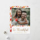 Affichez votre photo de famille préférée ici pour l'action de grâce. Décoré d'un motif de feuille recadré en rouge, orange, marron et vert pour diviser le texte de la photo. Le texte "So thankful" est écrit dans une police dessinée à la main d'or. Vous pouvez ajouter votre nom et année ci-dessous!