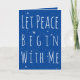Cette carte de vacances moderne présente un design typographique de la citation "Let Peace Begin With Me" en texte blanc écrit à la main sur un arrière - plan bleu saupoudré de flocons de neige. À l'intérieur de la carte est un salut pour vous de quitter est ou de personnaliser avec votre signature. Conçu par un artiste de renommée mondiale ©Tim Coffey.