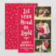 Le carte photo de vacances vertical dispose d'un arrière - plan rouge festif (peut être customisé) et élégant "Let Your Heart Be Light" stylisé de typographie de script brossé. Personnalisez le texte personnalisé avec votre nom de famille et votre année, et ajoutez vos trois (3) photos préférées au modèle de collage. Un motif de points blancs enneigés apparaît à l'arrière de la carte. Photographie © Storytree Studios, Stanford, CA