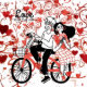 Illustration fantaisiste d'un couple sur un vélo, exutant joie et affection. L'homme, à l'expression ludique, saisit le guidon tandis que la femme, vêtue d'une robe à damiers, penche contre lui, ses mains serrées dans le bonheur.