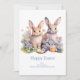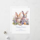 Un adorable ensemble de deux lapins assis dans un champ de fleurs et oeufs de Pâques en aquarelle sur cette carte de Pâques. 4-5 lignes pour vous de personnaliser.
