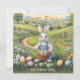 Une jolie carte de voeux avec l'illustration d'un lapin de Pâques tenant un panier d'oeufs colorés de Pâques. Le cadre est la campagne du printemps, avec vue sur les terres agricoles rustiques et les fleurs de saison. La salutation 'Happy Easter' se courbe en haut, tandis que le texte sous l'image peut être personnalisé avec votre nom(s) pour une touche de finition individuelle.