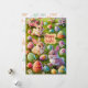 Mignonne lapin lapin rose et blanc sautant autour des oeufs de Pâques. Joyeux salutations de Pâques en rouge sur un arrière - plan jaune. Un mignon motif lapin au dos de la carte.